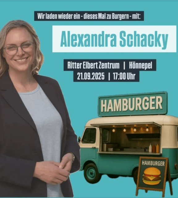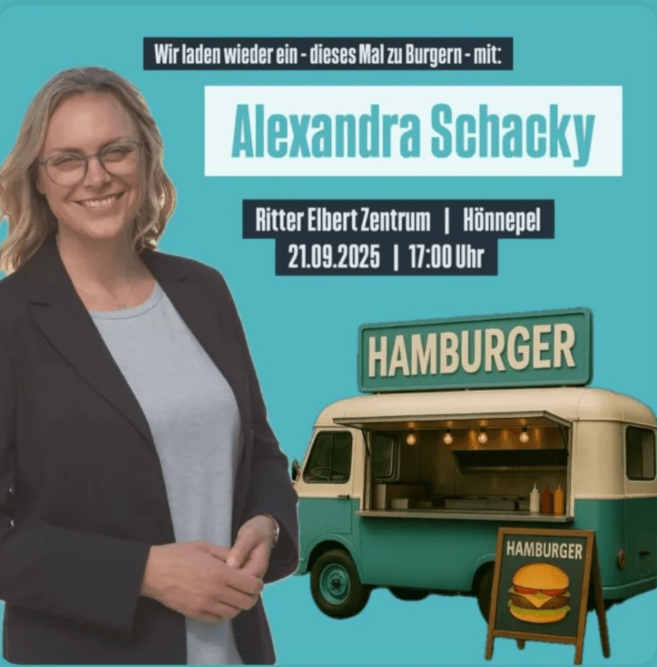 Sie sind herzlich eingeladen. Kommen Sie vorbei und kommen Sie mit unserer Bürgermeisterkandidatin Alexandra Schacky und weiteren Ratskandidaten ins Gespräch. Wir freuen uns auf Ihre Fragen und Anregungen. Direkt und bürgernah!